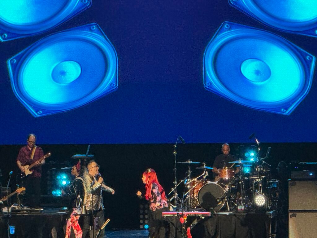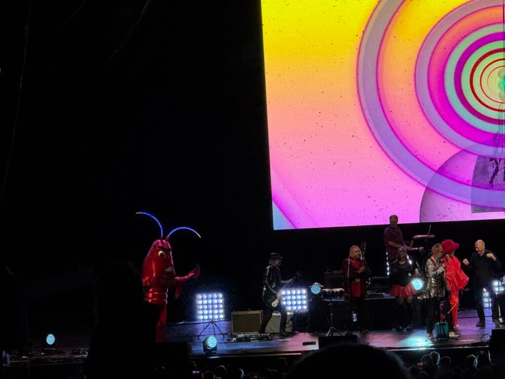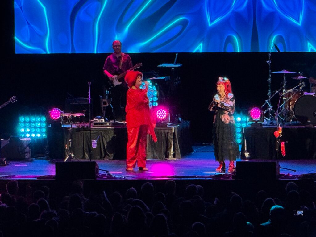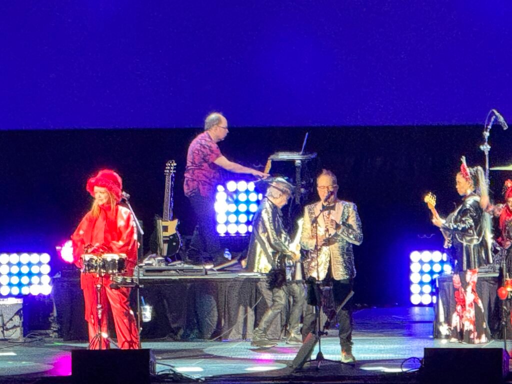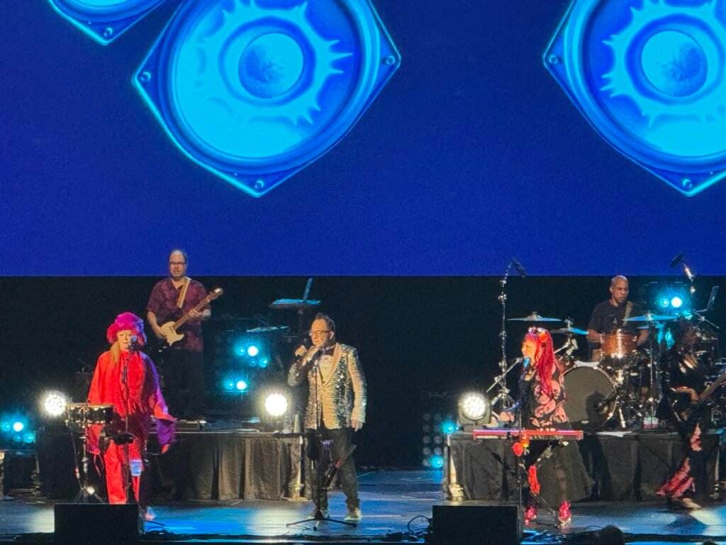 A pre‑show video montage warmed up the crowd. The video spliced snippets of “Legal Tender,” “Whammy Kiss,” and more with vintage clips of the band from Athens, GA. Then Fred Schneider, Kate Pierson, and Cindy Wilson hit the stage with “Cosmic Thing”. Cindy’s outfit was definitely an homage to “Rock Lobster” with flowing red sleeves and red hat.