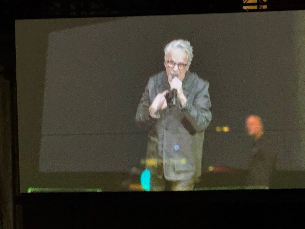 By 10:30, the crowd was buzzing, many wearing red domes atop their heads. A new Rod Rooter (a DEVO record executive nemesis from the past) video set the tone, and then DEVO stormed out with their manic energy dressed in black, opening with “Don’t Shoot (I’m A Man).” During the opening notes Gerald Casale was skanking like he was in a Two-Tone Ska band. BTW, did I mention that I love the English Beat! After a few moments, Mark Mothersbaugh came to the center of the stage and raised his arms like a televangelist of weirdness.