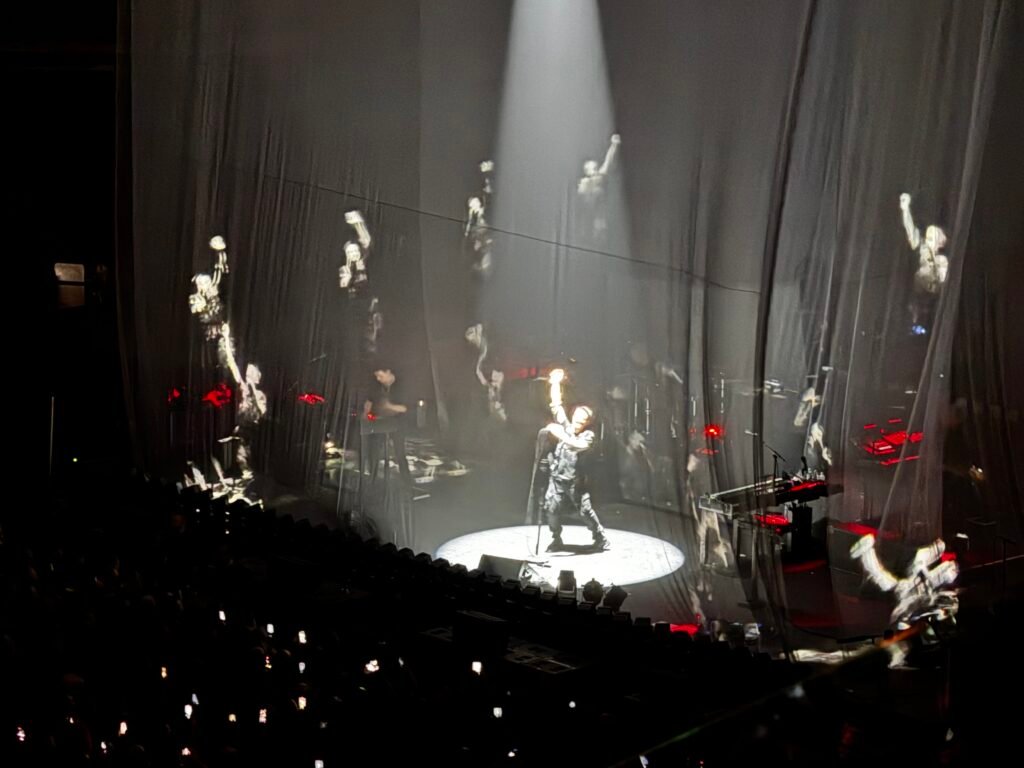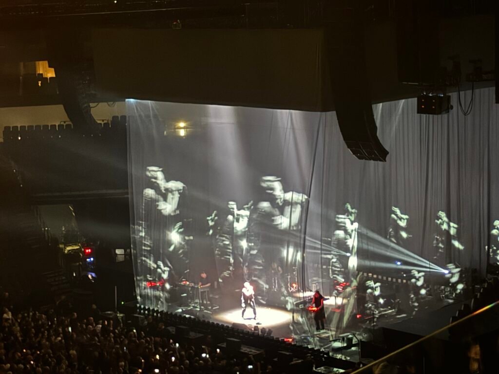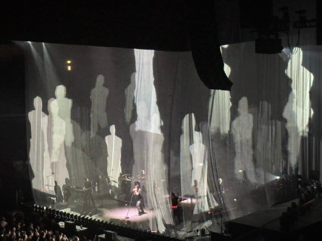 When the show shifted to the main stage, the scrim surrounding it came alive. Rear projections hit the surface and instantly transformed the band into silhouettes — sometimes sharp, sometimes fractured, sometimes multiplied. It wasn’t just a screen; it was a second stage, a shifting membrane between the performers and the audience.