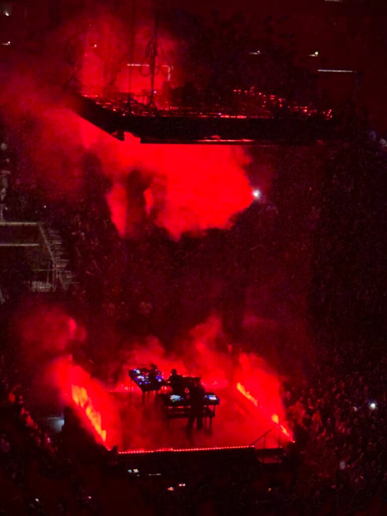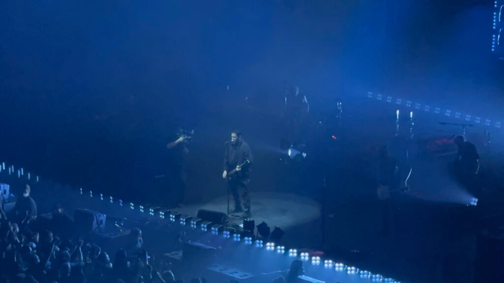 In contrast to the Lollapalooza show, the 2026 concert didn’t begin with a dramatic entrance or a blast of noise. Instead, the curtain dropped suddenly to reveal Trent Reznor alone on the B‑stage — a small, unassuming platform in the middle of the arena. Warm, full, bright lighting illuminated the entire stage and spilled into the crowd. Indeed, it felt almost vulnerable, like he was letting the audience in before the machinery of the show kicked into gear.