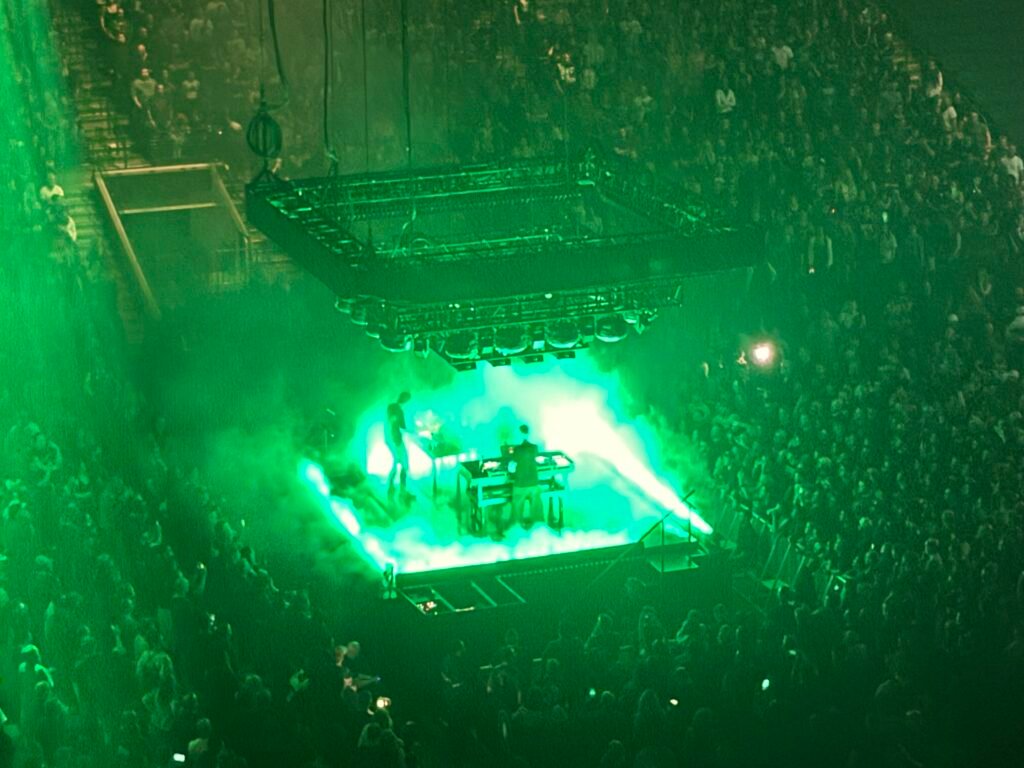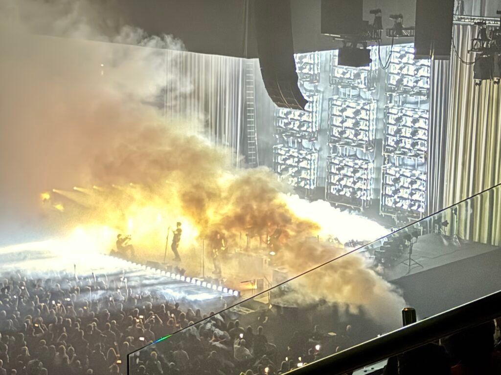 Massive spotlights from far above the stage shot straight down in perfect sync with the music, creating a UFO‑like effect. Behind the band, multiple square banks of lights — each with twelve lamps — fired in rhythmic patterns. Thin strips of lighting along the stage edges flared at key moments, outlining the platform in bursts of white.