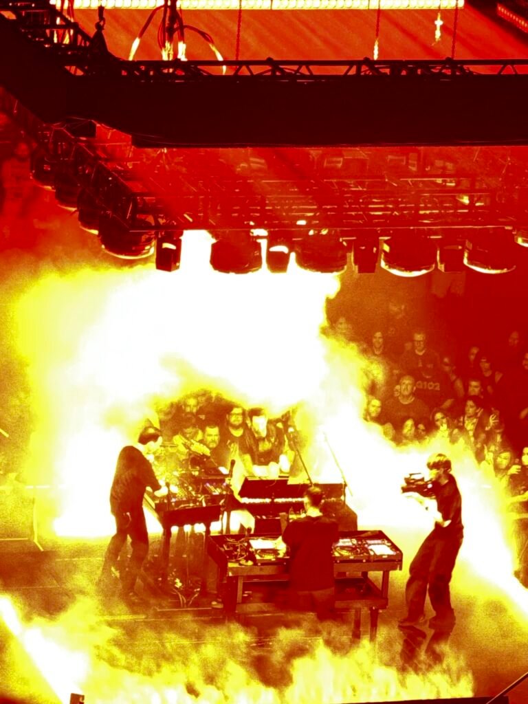 The second B‑stage segment shifted the tone completely. Boys Noize joined Trent, and the lighting changed from sharp and architectural to hazy and atmospheric. Alongside the lighting, heavy fog blurred the edges of the performers, and the colors — deep reds, greens, purples — blended into a mood rather than a pattern.